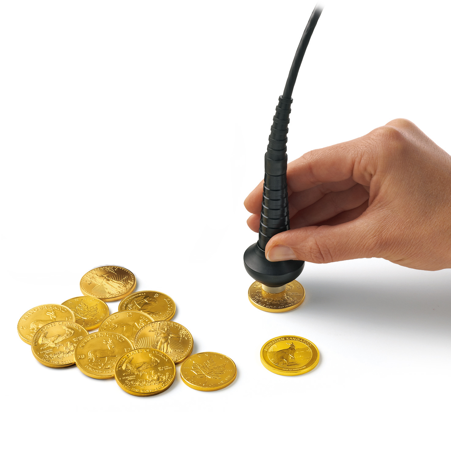 För testning av mynt och tunna tackor upp till ca 100 g. Identifiering av vanliga ädelmetallmynt som Krugerrand, Dukat etc med hjälp av deras kända konduktivitetsvärden.